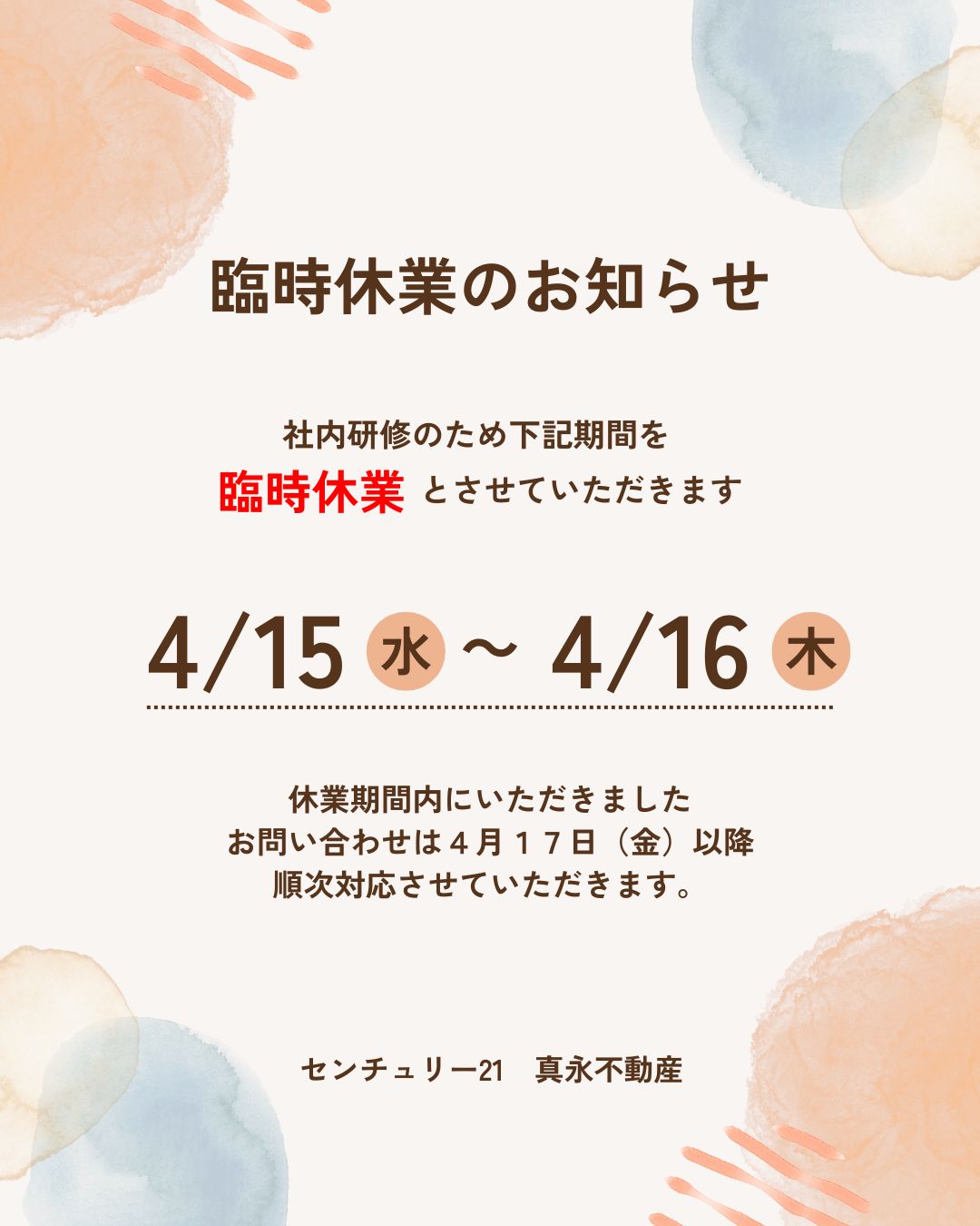 4月16日(木)社内研修による臨時休業のお知らせ